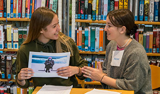 Wer stellt sein Lieblingsbuch am pfiffigsten vor und schafft es, das Publikum und die Jurorinnen aus den Nebenklassen in drei Minuten von sich zu überzeugen? – Diese Herausforderung meisterte die 10c auf sehr kreative Weise: Allein oder zu zweit schufen die Mädchen innerhalb von drei Schulstunden kleine Inszenierungen oder Monologe zu ganz verschiedenen Büchern: angefangen bei Schillers „Die Räuber“ über „Harry Potter“ und „Aristoteles und Dante entdecken die Geheimnisse des Universums“ sowie „Der Vorleser“ hin zum Siegerwerk „Erebos“. Lara Fechner und Eva Fischer holten sich mit diesem Jugendbuch, dem Format der Tagesschau, viel Sprachwitz und hohem Spieltempo den ersten Platz. Punktemäßig waren sie dicht gefolgt von Lydia Reindl, die im Alleingang einen spannenden Dialog aus Schillers „Die Räuber“ mit gekonnten Reimen und großen Gesten darbot. Eine gelungene Doppelstunde, großes Lob an alle Teilnehmenden!