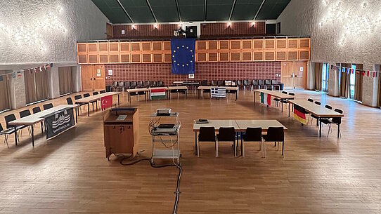 Am 17. April war es dann endlich so weit: Schülerinnen und Schüler sieben Augsburger Gymnasien finden sich zwischen vielen Europaflaggen bei uns im Barabarasaal ein. Im Hintergrund läuft Electronic-Dance, alle lesen sich noch einmal in ihre Rollenkarten ein und besprechen sich in ihrem Team, bevor das P-Seminar den Startschuss gibt und die EU-Kommission alle anwesenden Länder und Organisationen zum EU-Sondergipfel in Brüssel begrüßt. Verhandelt wird die akute Notsituation eines Schiffes der NGO "Seawatch", das darauf wartet, in einen italienischen Hafen einlaufen zu dürfen. Dieser Einzelfall dient als Anlass, um auf diesem Gipfel endlich eine solidarische und belastbare Lösung für die Asyl- und Flüchtlingspolitik der EU zu finden.