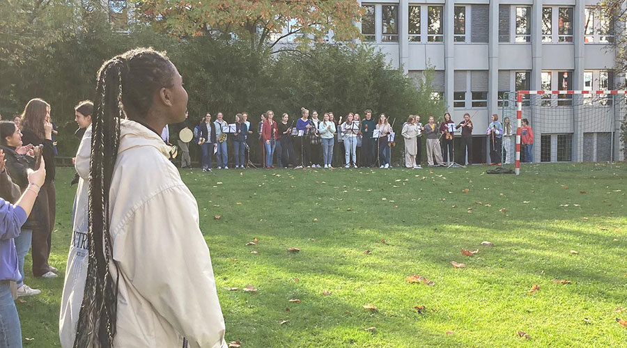 Es war ein packendes Duell, als am letzten Tag vor den Allerheiligenferien die Schülerinnen der Oberstufe gegen ein Lehrkräfteteam antraten. Bei perfektem Wetter – man könnte sogar von Kaiserwetter sprechen – wurde direkt nach Unterrichtsende mit viel guter Laune die Sportwiese zu einer echten Fußballarena umfunktioniert. Und nicht nur das, auch ein unparteiischer (?) Schiedsrichter aus dem Lehrerkollegium konnte gewonnen werden. Besonders packend, ein Stettenoriginal (!) ist es wohl, dass unsere Fußballspiele durch ein Musikorchester umrahmt werden. Auch musste das Orchester manchen kläglichen Schussversuchen seitens der Lehrkräfte ausweichen.