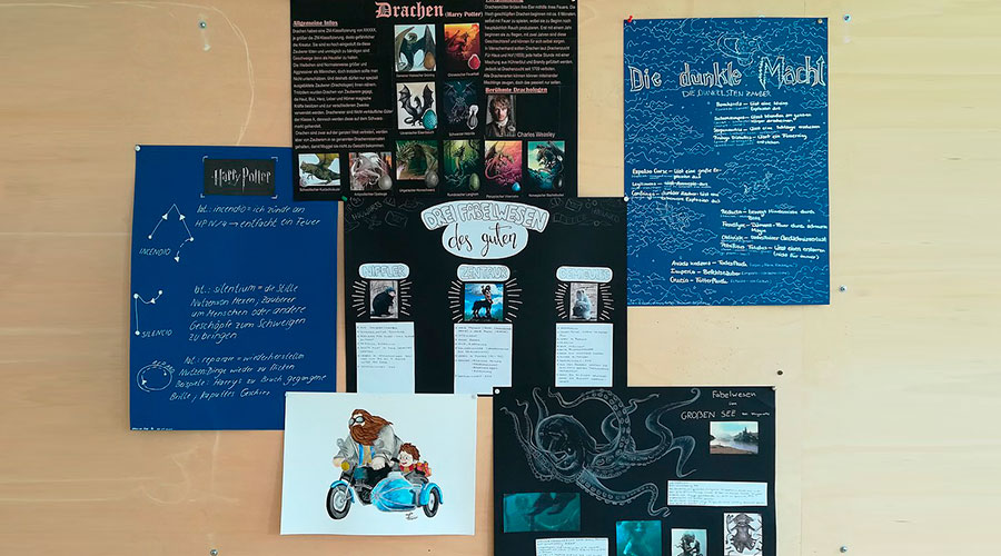 Nach der Übersetzung des ersten Kapitels des ersten Bandes „Harrius Potter et Philosophi Lapis“ („Harry Potter und der Stein der Weisen“) erstellten die Schülerinnen Plakate zu verschiedenen Bereichen des Harry-Potter-Universums. Diese stellten sie sich anschließend im Rahmen von kleinen Präsentationen im Klassenzimmer gegenseitig vor. Dadurch wurde wieder einmal deutlich, dass Latein keine „tote“ Sprache, sondern noch immer in unserer Zeit allgegenwärtig ist.