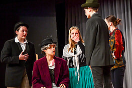 Im Mittelstufentheater entstehen jedes Jahr größere Produktionen, in denen sich bereits Schülerinnen ab der 8. Klasse ganz ernsthaft mit einer Rolle auseinandersetzen und sich auf der Bühne ausprobieren. Dabei entwickeln sich neben darstellerischen auch technische und organisatorische Fähigkeiten – und die Freundinnen werden ganz neu erlebt! Wir proben einmal wöchentlich auf der großen Bühne des Barbarasaals und führen unsere Stücke dort am Ende eines Schuljahres für die Schulgemeinschaft auf.