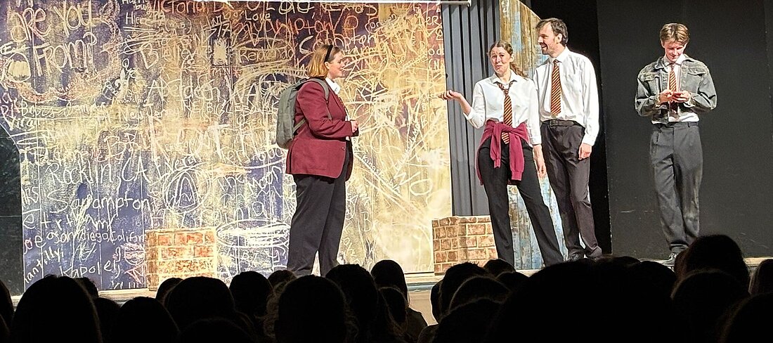 Für die 8. bis 10. Klassen des Gymnasiums sowie die 8. und 9. Klassen der Realschule stand anschließend das Stück „Sticks and Stones“ auf dem Programm. Dieses Theaterstück widmete sich dem ernsteren Thema Mobbing: Wie fühlt es sich an und welche Auswirkungen hat es auf Betroffene? In authentischen Szenen regte es zum Nachdenken an und zeigte, wie wichtig Empathie und der Mut sind, anderen beizustehen.