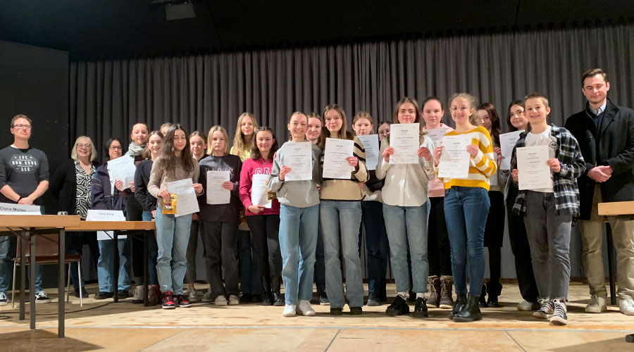 Am Ende setzte sich Amelie Klemmer (9a) als Siegerin durch, gefolgt von der Zweitplatzierten Nicky Köllensperger (9c). Beide qualifizierten sich durch ihre herausragenden Leistungen für die nächste Runde und werden unsere Schule in weiteren Wettbewerben vertreten. Glückwünsche gehen auch an die beiden weiteren Finalistinnen Annabell Schwaab (9c) sowie Mia-Sophie Lobina (9b).